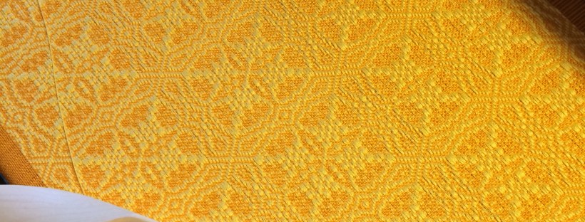 It does, alas, take longer than weaving a twill, but the resulting cloth so far is completely worth it. It’s beautiful to the eye, and to the touch. I’m a sucker for color, but also for texture: my maple shuttle is so, so smooth it’s almost buttery, and I love to work with it; the cloth is nubbly in a pleasingly patterned way that reminds me of soft upholstery from my childhood. If this were woven with two different fibers, then the texture would be different still, and pleasing in different ways. (And that is also on the list for future iterations of overshot.)